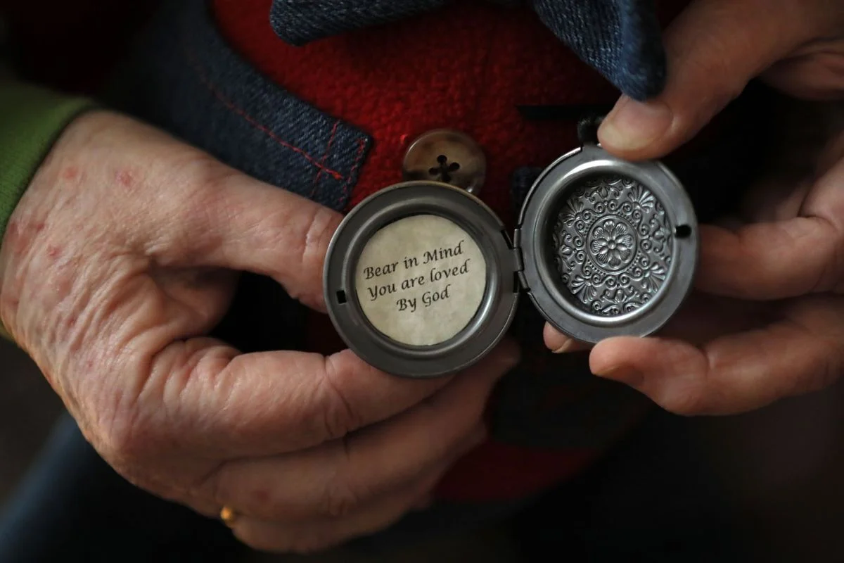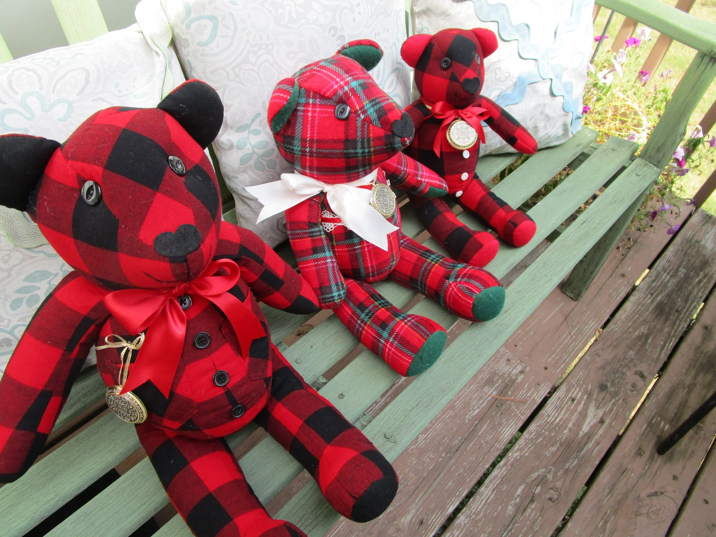 Each bear is handmade from your treasured materials, stuffed with hypo-allergic fill and adorned with a ornate locket with a special blessing - "Bear in mind, you are loved by God."